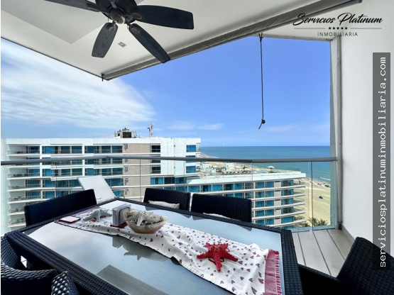 Apartamento de 84 m2 con espectacular balcón y vista directa al mar, una habitación privada con walking closet y baño interior, buen área social con cocina abierta,, zona de labores y un amplio balcón que disfruta de vista al mar y la ciénaga. El espacio de sala permite independizarse con puertas corredizas para permitir independizar el espacio en caso de en la noche se quiera disponer como otro espacio para dormir. El edificio cuenta con unos amenities de lujo, amplias piscinas con vista y acceso directo a la playa, jacuzzi, zona de bbq, gimnasio, salas al aire libre, turco entre otras. No permiten uso turístico mínimo rentas mensuales